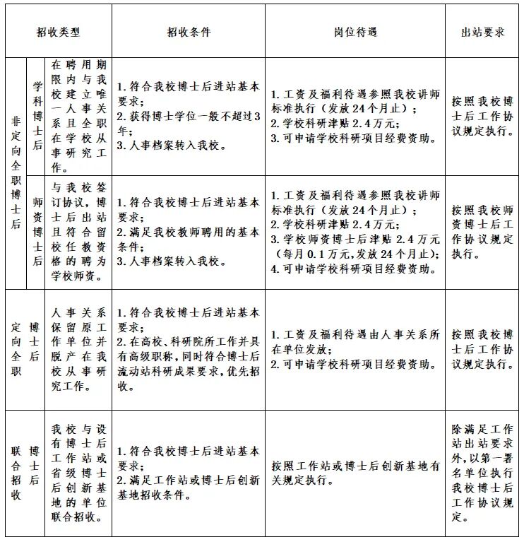 申请人需符合进站基本要求:获得博士学位一般不超过3年,申请进站的应届博士毕业生须通过博士学位论文答辩;品学兼优、身心健康;原则上年龄在35周岁以内(其他要求见各类具体招收条件);本校博士毕业生不得申请进入校内同一一级学科流动站。申请人必须保证在站期间全职从事博士后研究工作,在职人员不得兼职从事博士后研究工作。优先招收非定向全职博士后,择优招收定向全职博士后。