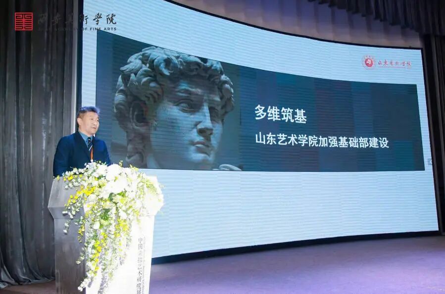 徐青峰以“多维筑基——山东艺术学院加强基础部建设”为题做了主旨发言。他表示,此次展览对中国高等美术教育发展具有积极意义,中国高等美术教育基础教学中的素描教学应建立更高的标准,以此引领学生向着更高的水平攀登。在提高标准的过程中,素描教学将起到关键作用,学养、艺术修养、理论水平,都要通过造型的手段来实现。作为基础的素描是决定教学和艺术创作走多远的最重要的因素。徐青峰从时代背景入手,结合时代之忧,展现时代的答卷、山艺的答卷,他深刻剖析了素描教育的时代要求和发展瓶颈,汇报了山艺近几年来的经验做法和取得的成绩,并对未来素描教育的发展提出了意见建议。