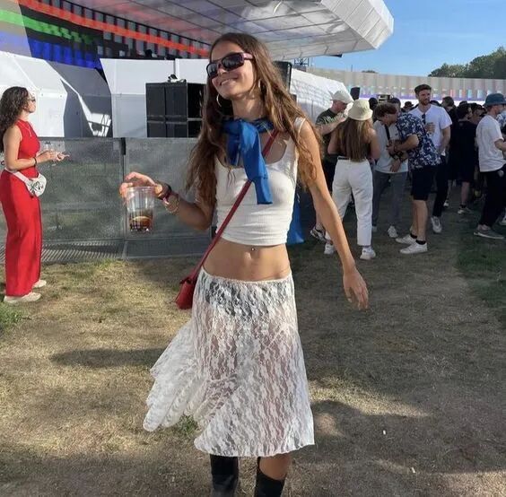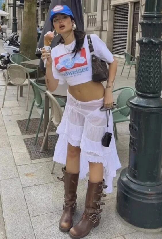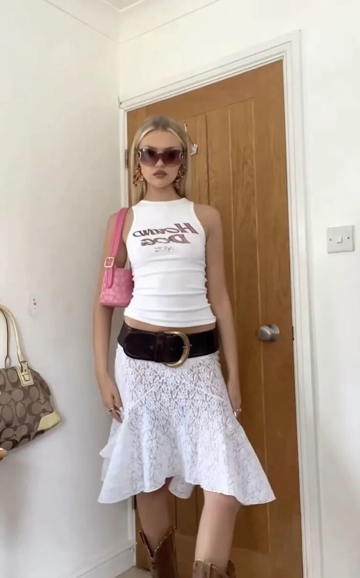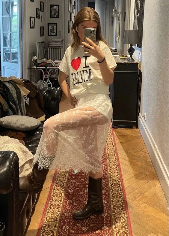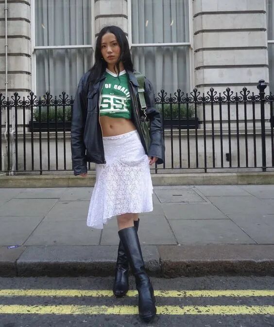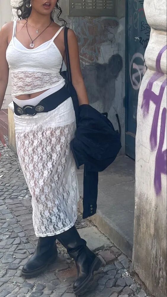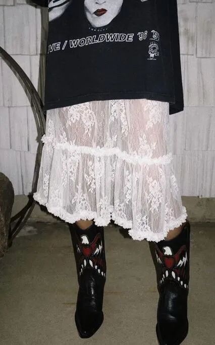 尤其是白色和蕾丝的组合,本身就会给人华丽和女性化氛围,这个时候,可以通过牛仔靴、铆钉腰带或者一些其他中性单品弱化较强的性别属性。