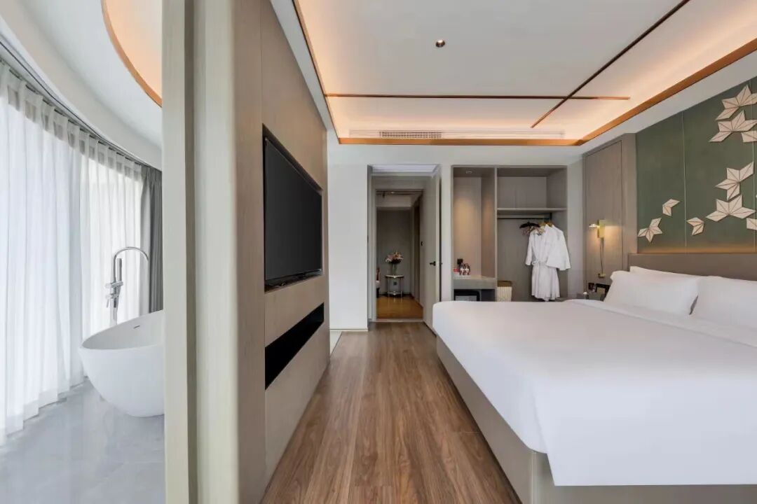 公寓拥有68间豪华客房,包括高级房、豪华房、行政套房等多个不同房型,部分房间配备智能化设备,只需动动嘴巴即可实现很多房间内场景转换,智能行政套房还带有180度全景落地窗以及可观景豪华浴缸。