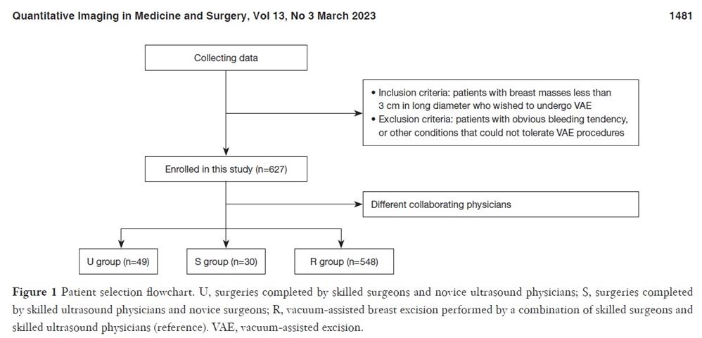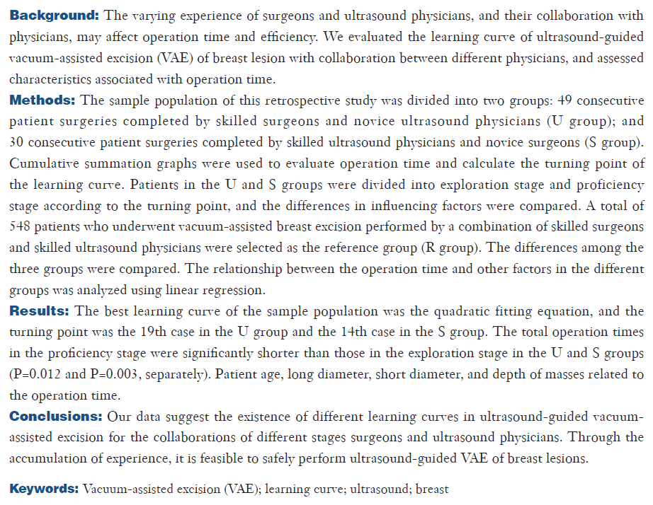 近年来,超声引导下乳腺病变的真空辅助切除(VAE)已成为乳腺良性病变开放切除的一种可接受的替代方法。此外,与典型的14G空芯针活检相比,8G或11G的VAE针可获得更大体积的标本,从而更准确地诊断乳腺病变,包括非典型导管增生或导管原位癌。鉴于VAE在乳腺肿块的诊断和切除中的重要作用,这项技能的获得需要适当的训练,也需要时间和病例的积累,如立体定向乳腺核心活检或乳腺肿块检测和诊断的深度学习。基于外科医生和超声医生的不同经验,以及医生之间的合作,可能会影响手术的时间和效率。这可以根据时间轴分为探索阶段和熟练阶段。因此,可能会有一个学习曲线 。对这一学习过程进行准确的评价和总结,对于指导未来团队开展这一过程具有重要意义。过去采用简单的分组方法来评估学习过程,这种方法的优点是对数据要求不高,缺点是拐点计算不准确。累积和分析(CUSUM)可以绘制学习曲线,模拟方程,准确计算出从探索阶段到掌握阶段的学习拐点。然而,关于合作医师不同经验组合的研究却很少。在中国,大多数VAE手术是由外科医生和超声医师合作进行的。超声医师负责定位和指导,外科医生负责切除病变。因此,我们旨在利用CUSUM回顾性分析熟练外科医生与无VAE经验的超声新手医师组合,以及新手外科医生与熟练超声医师组合的学习曲线。我们根据 STROBE 报告清单呈现以下文章。