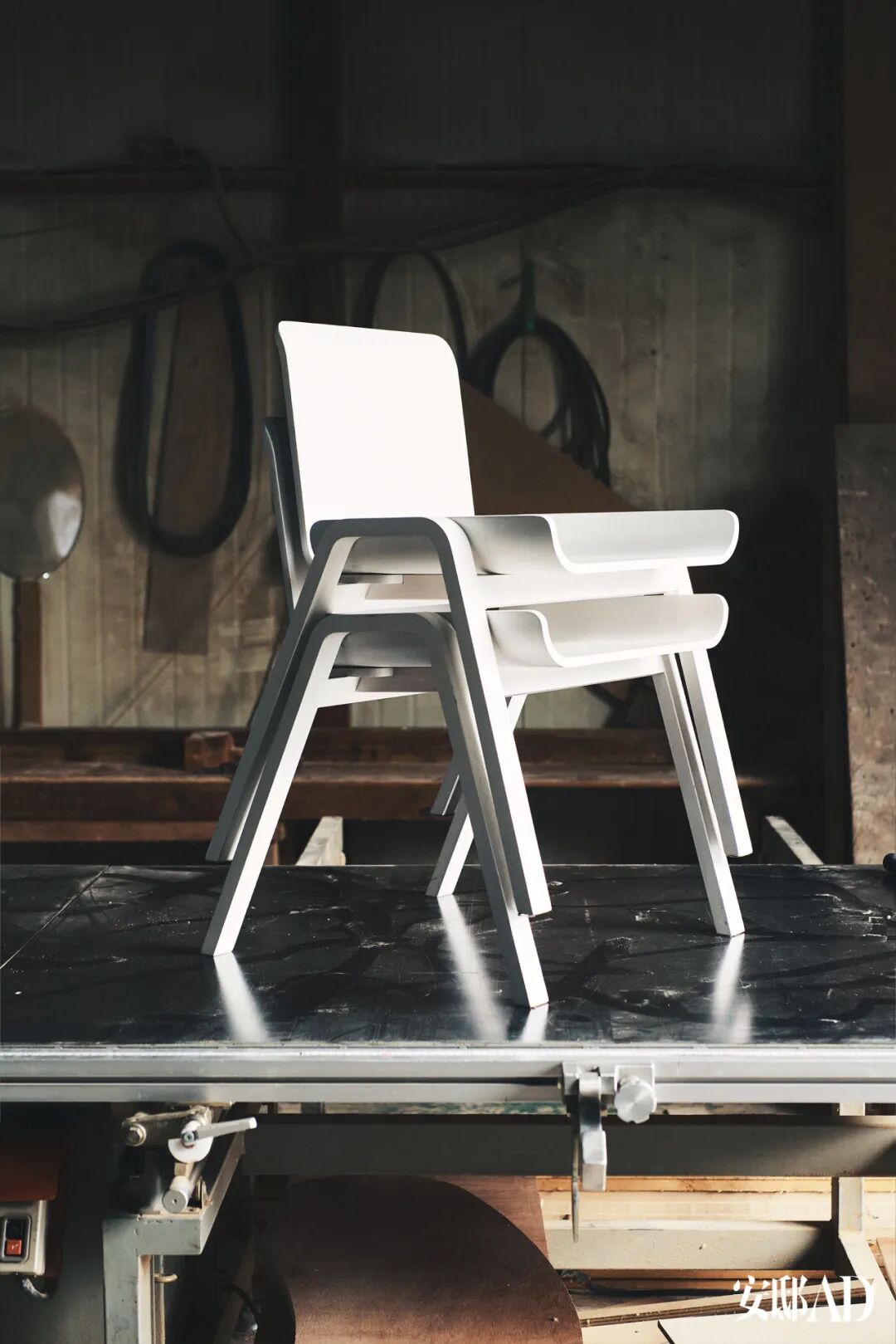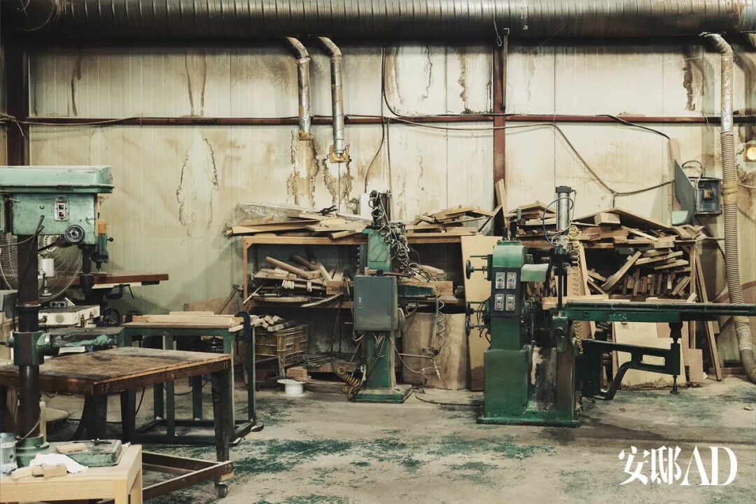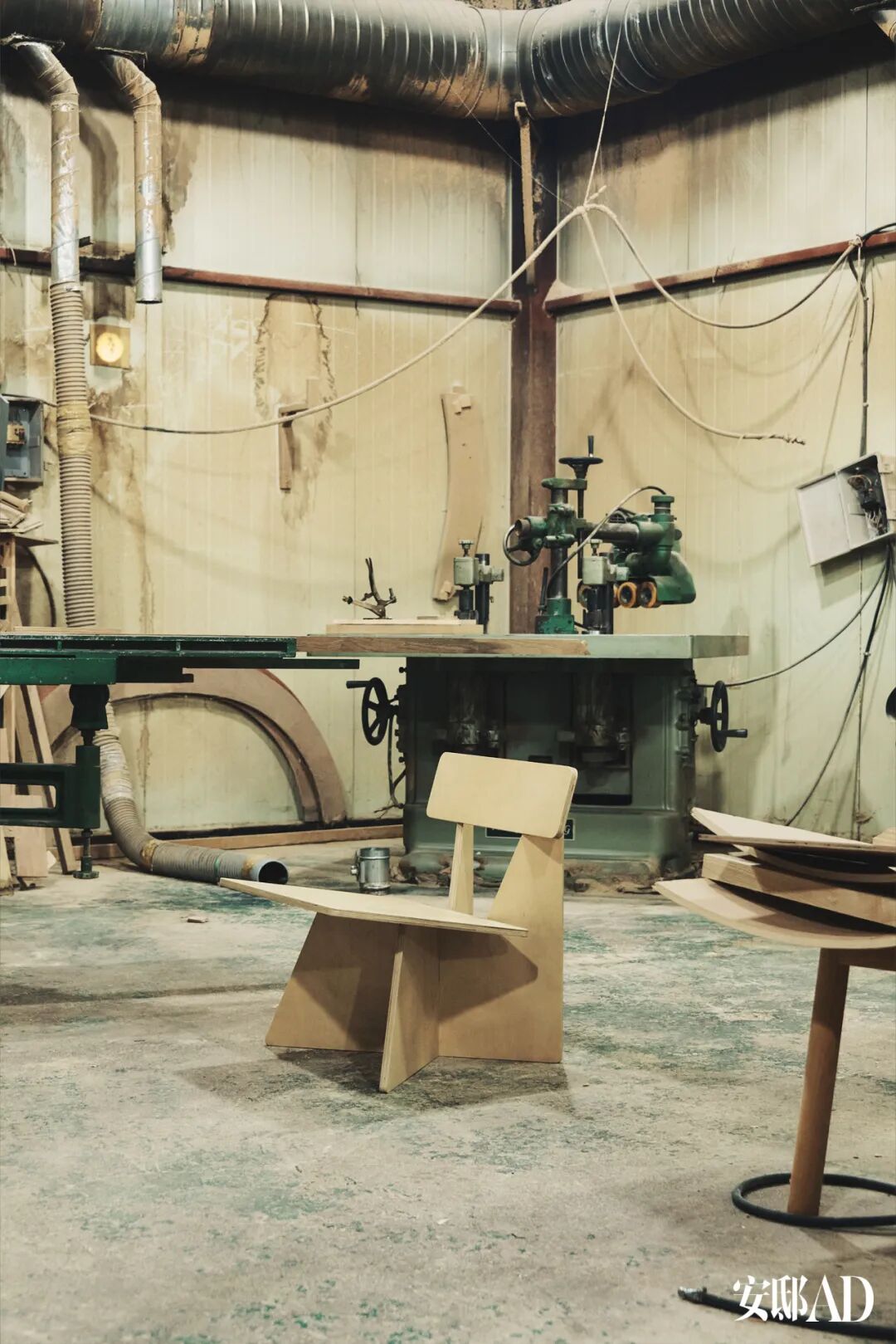 工厂车间的另一视角,一张来自“Four B=brothers”系列(2012,W580 X D625 X H590mm)的木制座椅模型伫立其中,这个系列座椅的亮点在于制作过程中不会浪费任何材料,在车间开始进行制作之前,Mun会先在首尔的工作室中使用3D打印制作样本并进行测试,确保设计和生产过程始终流畅,减少浪费经济和时间成本。