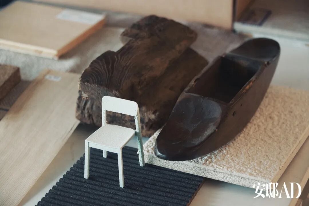 工作室内可见各种应用于不同项目的天然材料,有的是来自Mun的家乡济州岛,有的是来自项目遗留的“边角料”,也有团队成员四处搜集而来的回收材料;工作台上还摆放着Mun从济州岛奶奶家带过来首尔的传统木制工艺摆件。