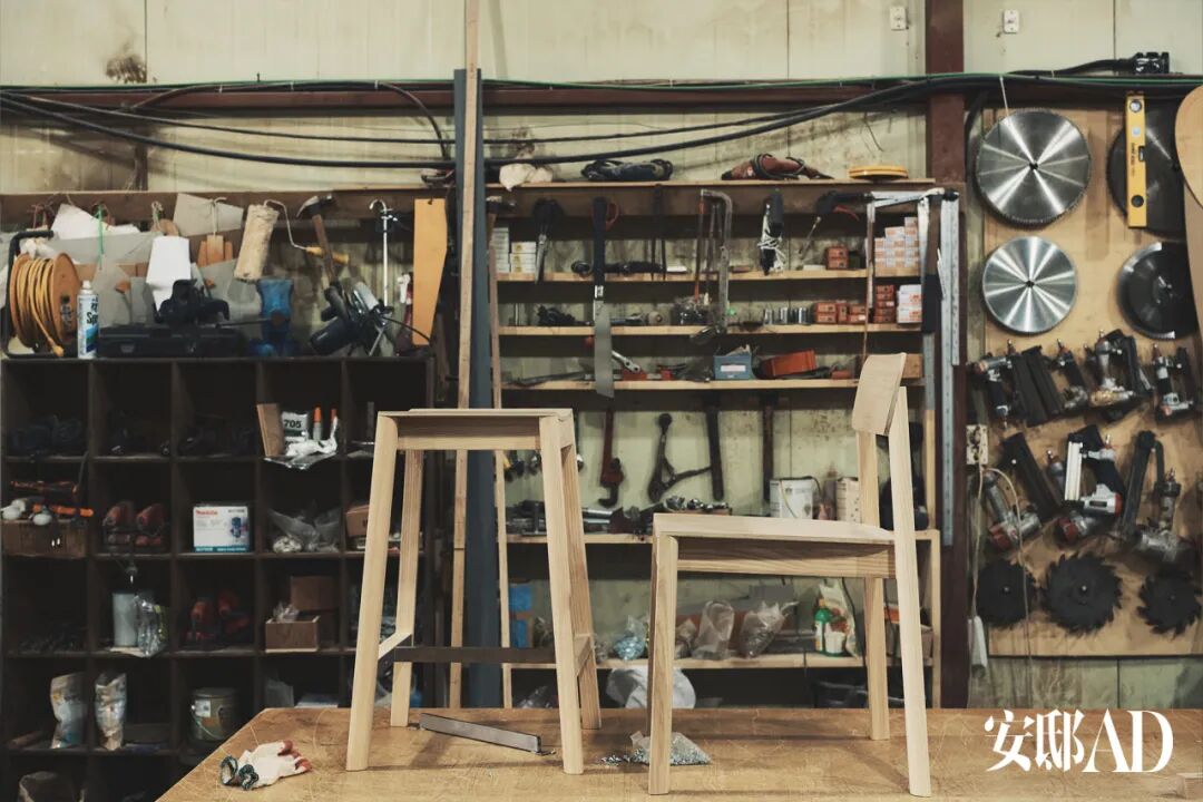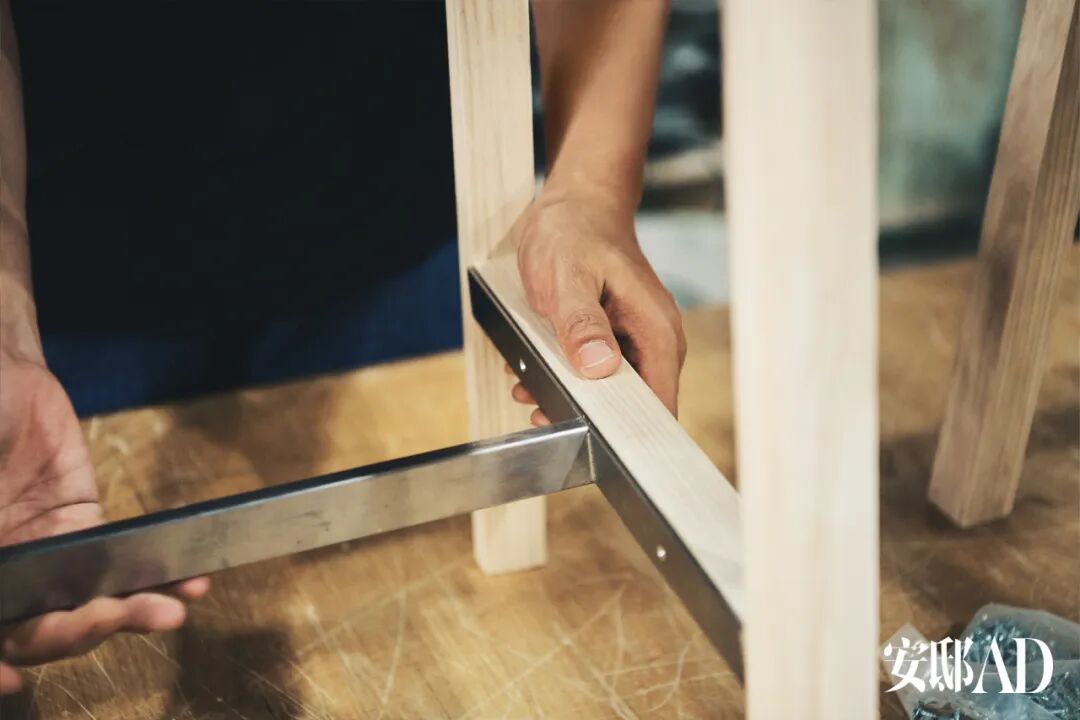 Mun在车间中对自己所设计的家具作品样本进行组装、测试以及检查各项细节。