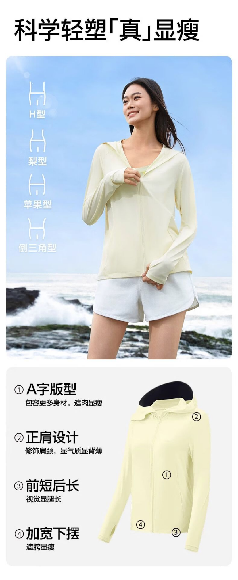 没有明星身材的姐妹们,也不用担心,这款正肩款的防晒衣,可以包容多种身材,前短后长,更显腿长,不止于防晒,更具美感。