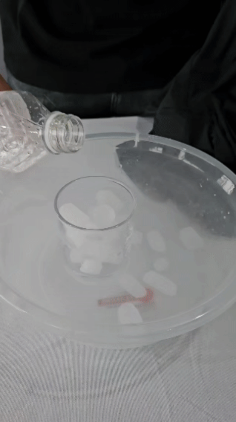 把衣服紧紧蒙在冒气的干冰上,气体呼呼穿透衣服。