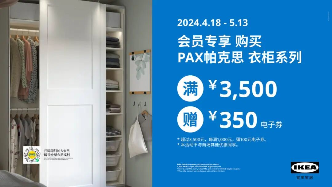 同时,4.18-5.13,购买PAX帕克思衣柜系列满¥3500赠¥350电子券。