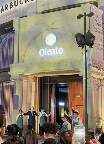 来到吴江路靠近石门一路的路口,便能看到星巴克的巨大围挡,Oleato®的标识,正预示着一个惊喜的到来。而在星巴克臻选®上海烘焙工坊外的广场上,一个精心缔造的“西西里橄榄园”限时闪现。盛开的鲜花、绿意盎然的橄榄枝和咖啡枝,和巴洛克式的阳台,共同营造了一个城中的意式风情胜地。晚宴正式开始前,在这里伴随着傍晚的微风,聆听着浪漫的意大利民调,喝上一杯咖啡,仿佛置身西西里岛的海边,惬意无比。“西西里橄榄园”的户外装置会持续到3月31日,有机会一定要来体验!随后,在万众期待中,这次晚宴的主角——星巴克创始人霍华德·舒尔茨终于登场,并邀请我们一同进入晚宴现场。![]()