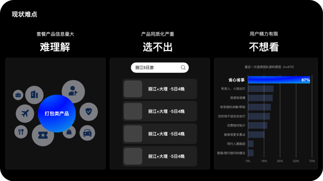 正因为打包套餐的特性,团队游产品本身的设计就存在很多难点:1. 由于聚合了机票、酒店、门票等多种资源,产品信息量大,用户理解费力度高;2. 每个供应商都想要在最短的时间里给客户体验最好玩的线路,而热门线路本身就比较同质,呈现出来的产品大同小异,用户很难选出心怡的产品;