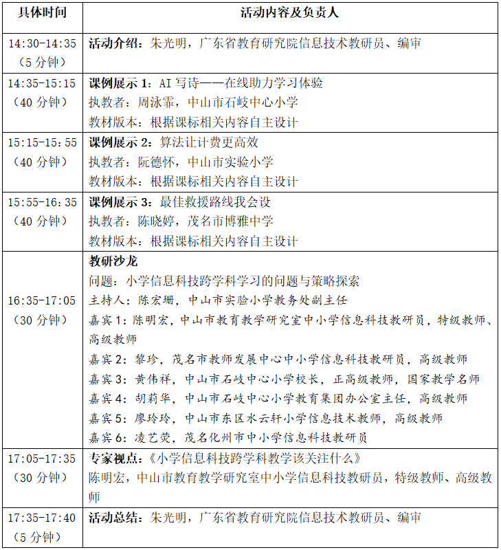本次活动希望通过案例分享、专家视点、教研沙龙等形式,探讨如何构建学科逻辑关联、“科”与“技”并重的跨学科学习。通过“在线学习与生活”“身边的算法”两个模块的典型课例展示,呈现小学信息科技教育跨学科学习的新样态,推动小学信息科技课程体系落地,发展学生核心素养,落实立德树人根本任务。