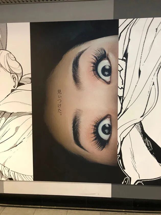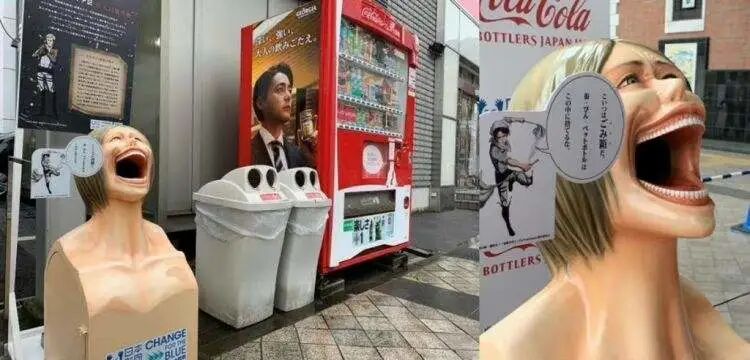 就拿之前阵子日本大阪世博会插画海报,一经发布也在网上引起了一顿吐槽。长这样:盒子里四处溅出来的眼珠子,就很。。。日本风格,难不成是因为核辐射(bushi)。而他们的吉祥物也是这样的,长了五个眼睛的小怪兽,被吐槽“奥特曼看了都要打上一拳”。但也不可否认,怪异的形象,掀起了全球网友的热议。并且之前也有网友觉得日本的审美一贯如此,一直很阴间。这句话真的总结得很到位,日本很多海报设计在,真的越阴间越好,可能他们的设计师都有一个拍恐怖片的梦想。之前真人版电影《约定的梦幻岛》宣传海报,布满漫画的墙面暗藏一张狰狞的脸出现在各个角落,也是看得人毛骨悚然。还有之前日本街头出现的进击的巨人垃圾桶,看完都不敢丢垃圾了。。。东京奥运会开幕式,日本公园的人头气球,也是主打一个阴间。