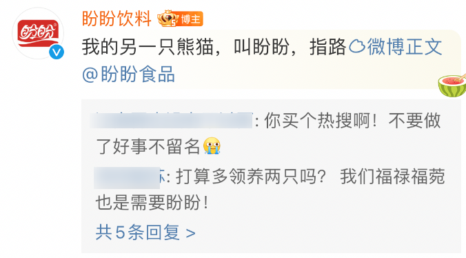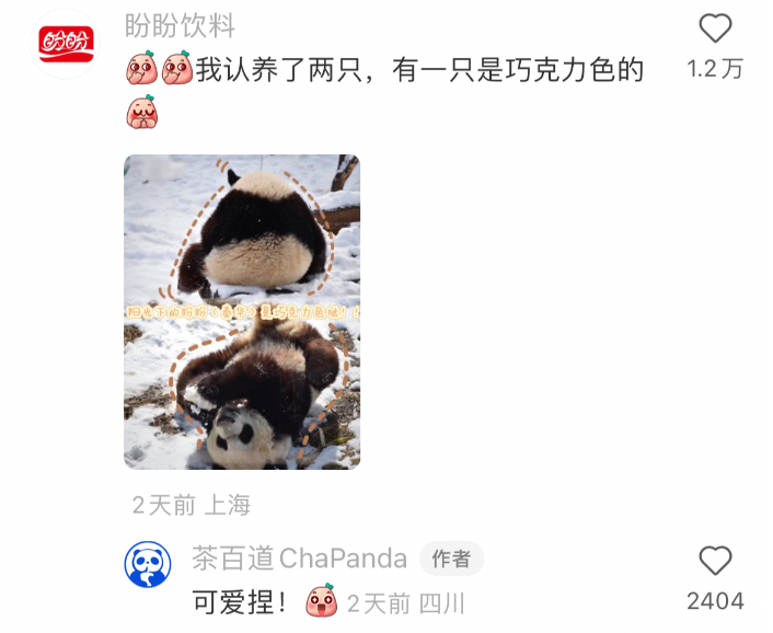 虽然认养丫丫没有成功,但隔了6个月以后,蜂花认养了一只名为家欣的熊猫,并取名为花宝。还有去年茶百道官宣终身认领大熊猫的评论区,盼盼自爆认养了两只大熊猫,让网友感叹太低调。2021年,盼盼食品发布全新的IP形象——一只熊猫,同时宣布终身认养一只秦岭大熊猫秦华,并取名为盼盼。值得注意的是,盼盼的食品名字,是受到了第11届北京亚运会吉祥物大熊猫“盼盼”的启发。由此,品牌名称、IP形象与认养的动物达到统一,以此减少受众对品牌的识别成本。还有去年7月22日,鸿星尔克在感恩成长日期间,宣布开启“大熊猫守护计划”,终身认养大熊猫七仔。