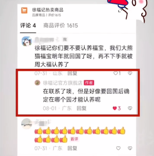 或许是因为福宝的称呼当中有个“福”字,又或许是觉得卖珠宝的财大气粗,去年福宝回国的消息传出以后,就有网友喊话周大福认养福宝,周大福客服回应:关于认养事宜,公司内部已经在研究当中。后来,在周大福直播间,也有网友询问周大福是否认养福宝,官方回应:已经申请了。继周大福之后,有网友喊话徐福记要不要认养福宝,徐福记官方旗舰店回应:已经在联系了。