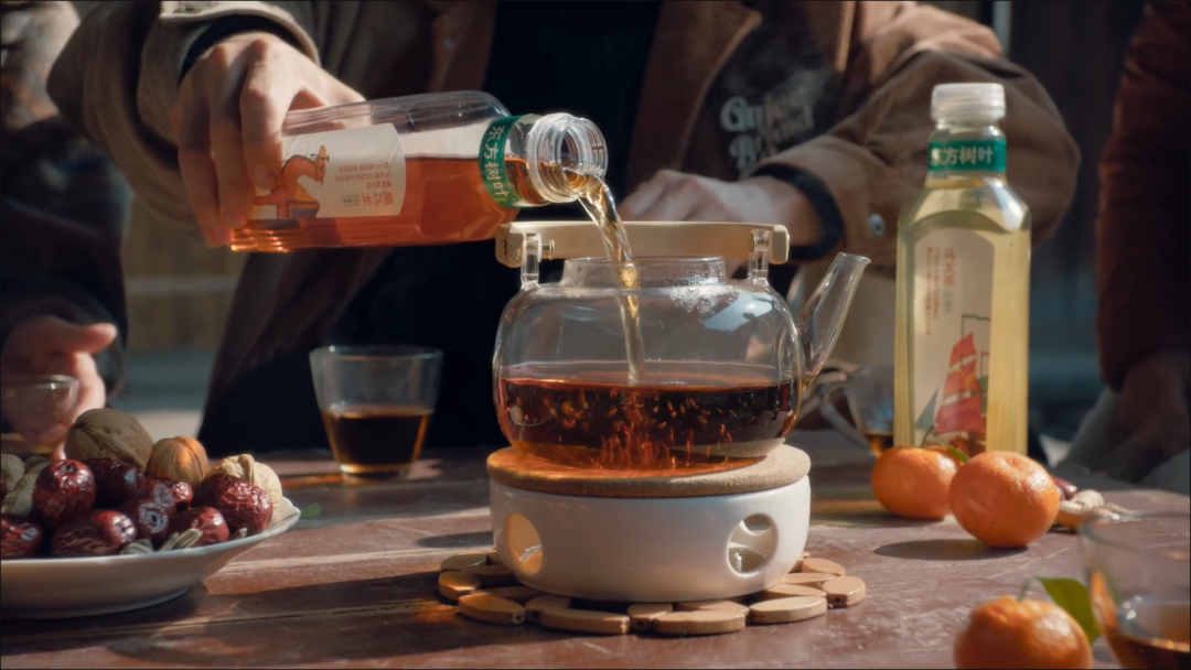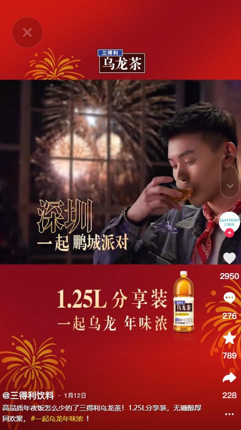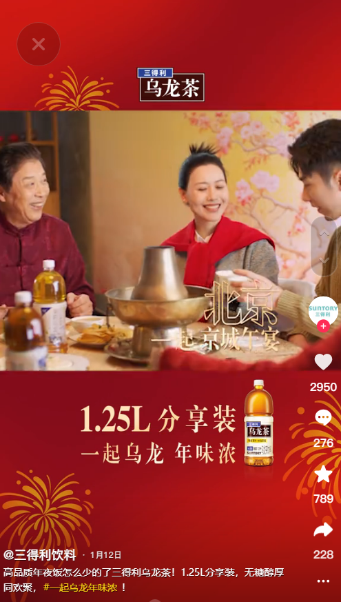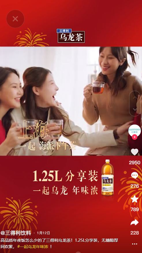 在三得利官方账号发布的内容中,我发现,整支广告其实是一个系列,按照四个城市具备代表性的生活方式划分了「老广早茶」「京城午宴」「海派下午茶」「鹏城派对」四幕场景,串联起「一起乌龙年味浓」的茶饮场景教育。