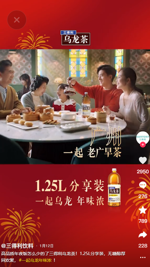 只见一家五口其乐融融地在一家茶楼喝早茶,餐桌上摆着一瓶三得利乌龙茶,画面附上文字:一起老广早茶。