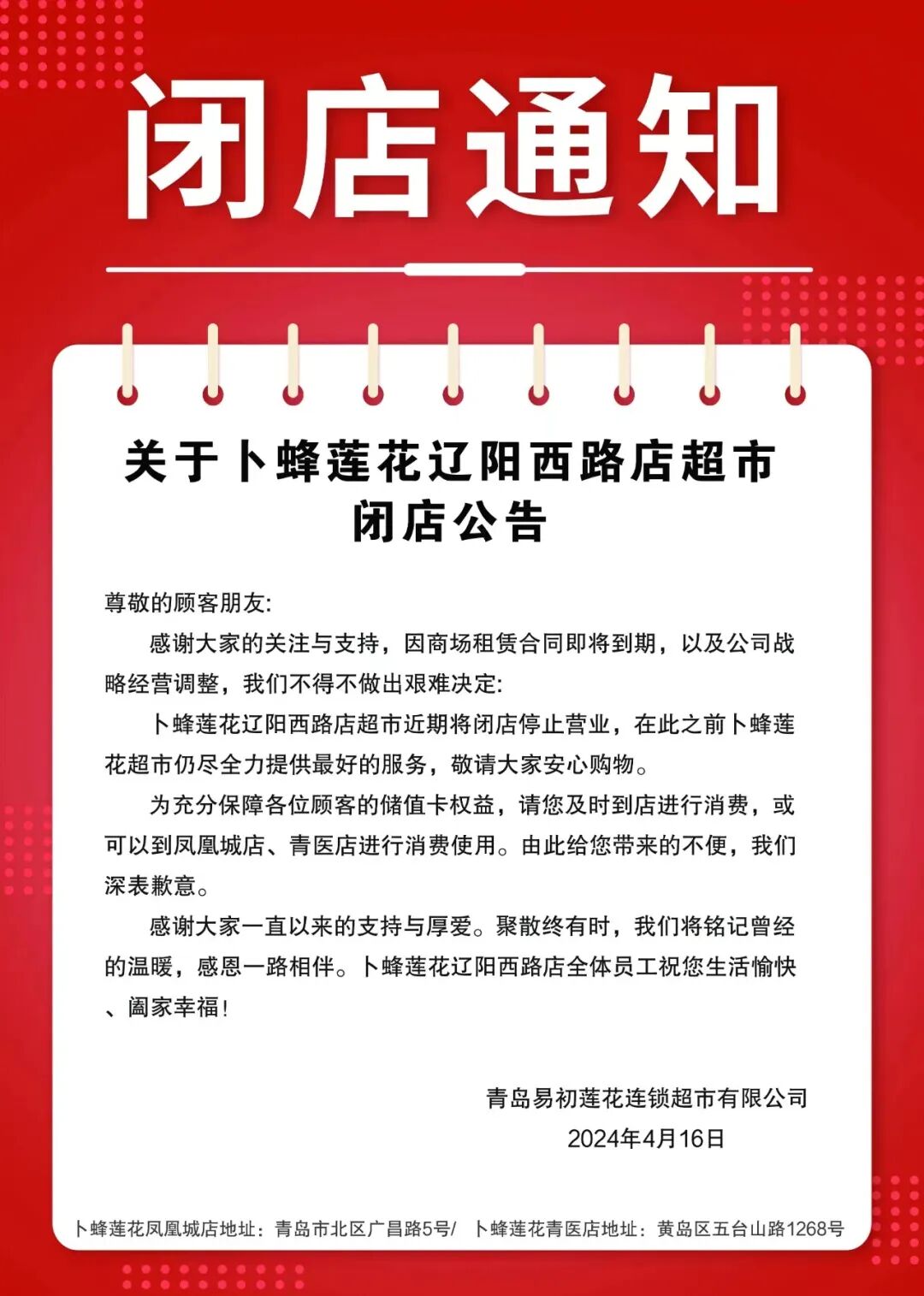 “感谢大家的关注与支持,因商场租赁合同即将到期,以及公司战略经营调整,我们不得不做出艰难决定:卜蜂莲花辽阳西路店近期将闭店停止营业……”近日,位于卜蜂莲花辽阳西路店超市发布闭店通知,店内商品也进行着最后的出清销售。据了解,这家卜蜂莲花在青岛已营业了18年,也是最早落户浮山后片区的大型商超,承载着不少人的生活记忆。如今这家深耕青岛市场多年老牌超市走到了悄然闭店的一步,不免让人唏嘘。01