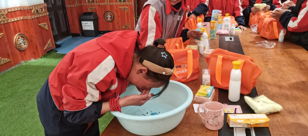每个“洗漱包”里包含毛巾、牙刷、牙膏、漱口杯、香皂、洗发沐浴露和面霜,给孩子们满满的健康呵护。