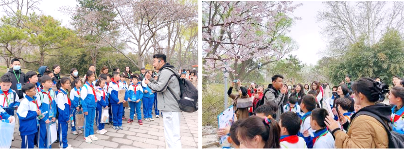 *自然教育专家“沧龙”老师,最擅长植物科普,现场为志愿者和孩子们讲解樱花、山桃、迎春等春季植物的品种、特点和生长环境等相关知识。