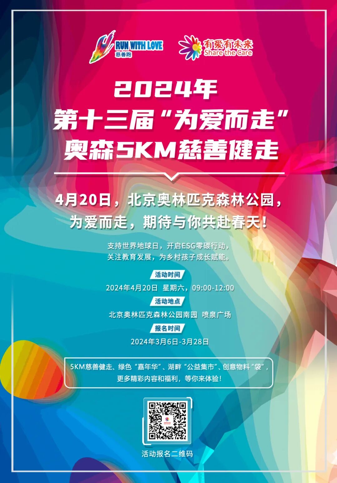 2024年第十三届“为爱而走”奥森5KM慈善健走,将于4月20日在北京奥林匹克森林公园举办,5,000位同行者将以行走的力量,响应世界地球日主题,倡导减塑减废,为生态环境减负,以实际行动创造“零碳地球”。截至目前,已有30家企业,超过2,000名员工志愿者报名参与。