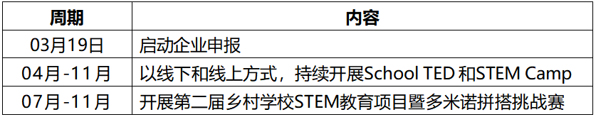 为每所乡村学校捐赠20套STEM学习包,并支持学校组织开展多米诺训练,组队参加多米诺拼搭挑战赛。