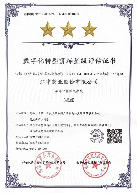 国家数字化转型成熟度贯标评估由工业和信息化部组织开展。旨在以贯标引导企业加速数字化转型,培育数字化转型服务生态,增强企业数字技术融合应用能力,促进重点区域、重点行业数字化转型成效提升。评估围绕企业数字化转型发展战略、新型能力、系统性解决方案、治理体系和业务创新转型5个领域展开,本次获评有助于江中药业进一步提升企业智数化能力,促进新质生产力发展。
