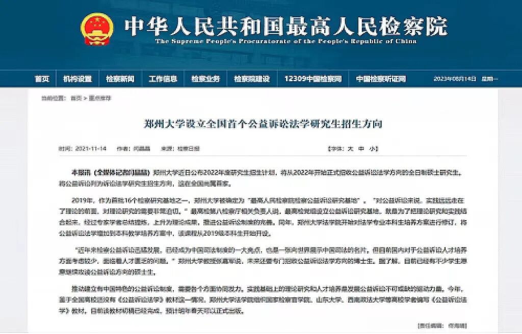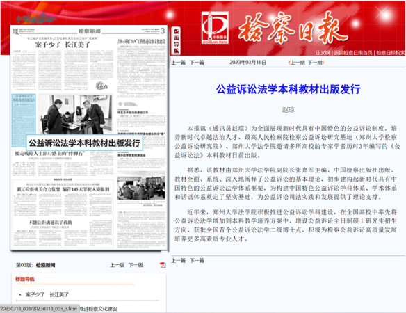 四是牵头编写全国第一部高校本科公益诉讼教材。郑州大学牵头,邀请国家检察官学院、山东大学等单位专家学者共同编写全国首部高校本科生教材《公益诉讼法学》,被全国人大监察和司法委员会作为立法重要参考。在教育部教材局支持下,正在编写《公益诉讼案例教程》。