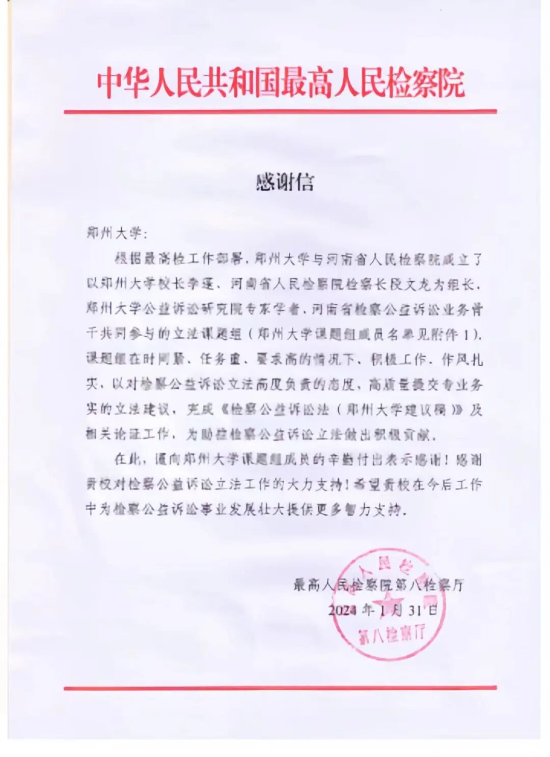 二是牵头起草全国第一个高校版公益诉讼立法建议。2020年,郑州大学和河南省人民检察院合作起草《检察公益诉讼法》建议,受到最高人民检察院领导批示。2023年,郑州大学再次和河南省人民检察院联合成立课题组,完成《检察公益诉讼法(郑州大学建议稿)》及相关论证工作,受到最高人民检察院第八检察厅的感谢信。