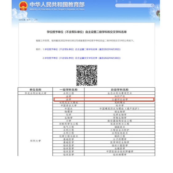 三是设立全国第一个公益诉讼二级博士点。获批全国首个“公益诉讼法学”二级博士点,已正式招收2名中外联合培养的公益诉讼博士生,并将持续招生。