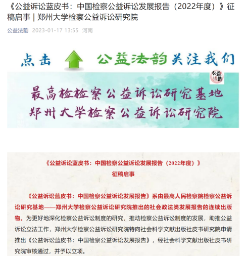 五是编写全国第一套检察公益诉讼蓝皮书丛书。面向全国检察机关以及学界征稿,出版第一部公益诉讼发展蓝皮书《中国检察公益诉讼发展报告(2023)》,2024年度的报告也即将出版。