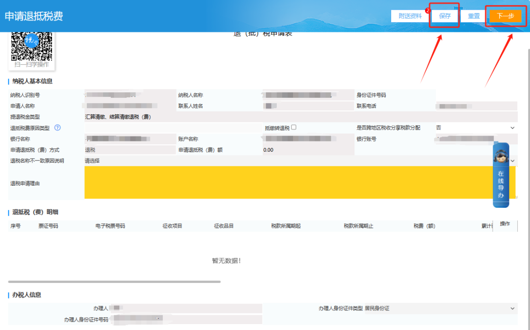 情况一:如您进入后提示“尊敬的纳税人您好,您存在可退税的金额为0.00元多缴税(费),请您核实”,请您点击“确定”,然后在“退抵税(费)明细”栏目点击“多缴查询”按钮,查到后勾选您需要退的税,填写黄色必填项,上传必报附件,点击保存一下一步,提交后等待税务机关受理即可。