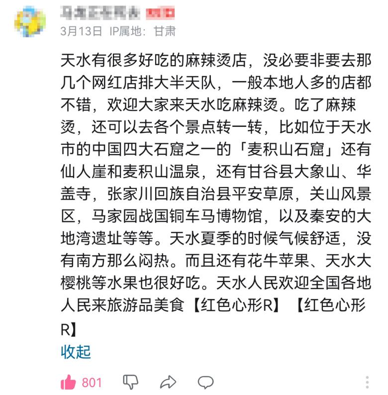 看着全国网友的群体吃瓜,部分甘肃人表示,天水明明还有伏羲庙、麦积山石窟、秦安大地湾遗址等历史人文胜地,为何你们独宠麻辣烫?