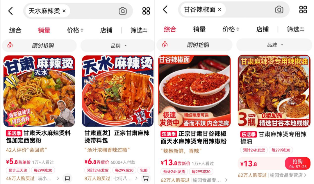 天水麻辣烫宽粉、料包、辣椒均成天猫站内爆款