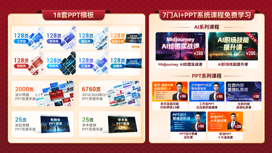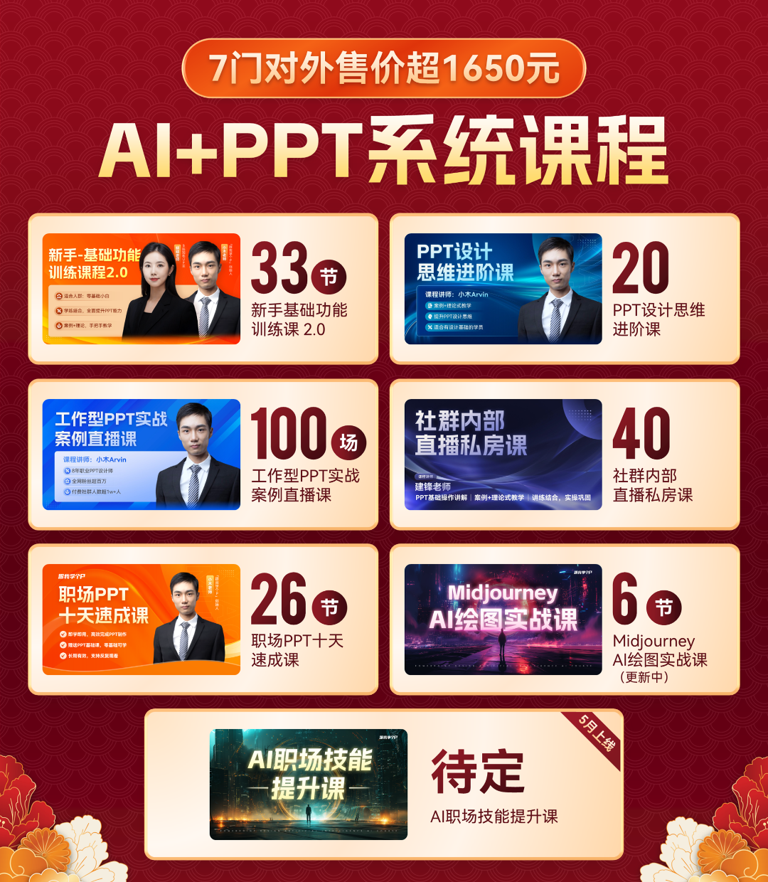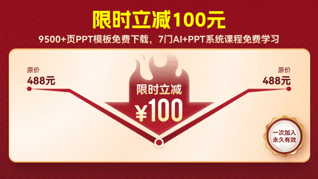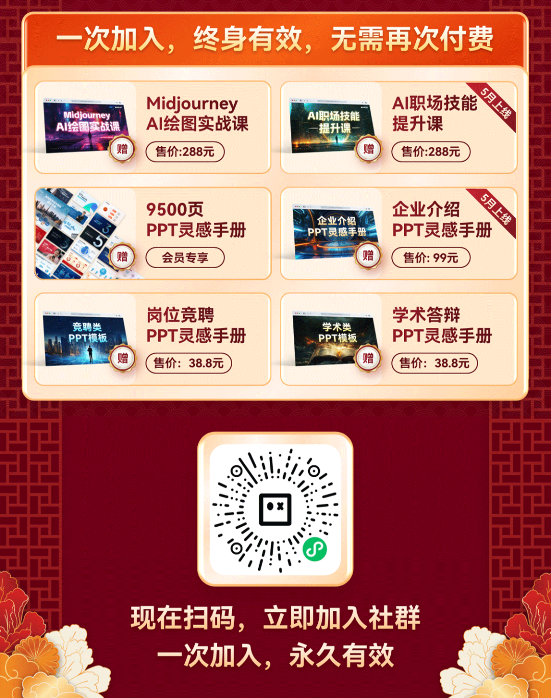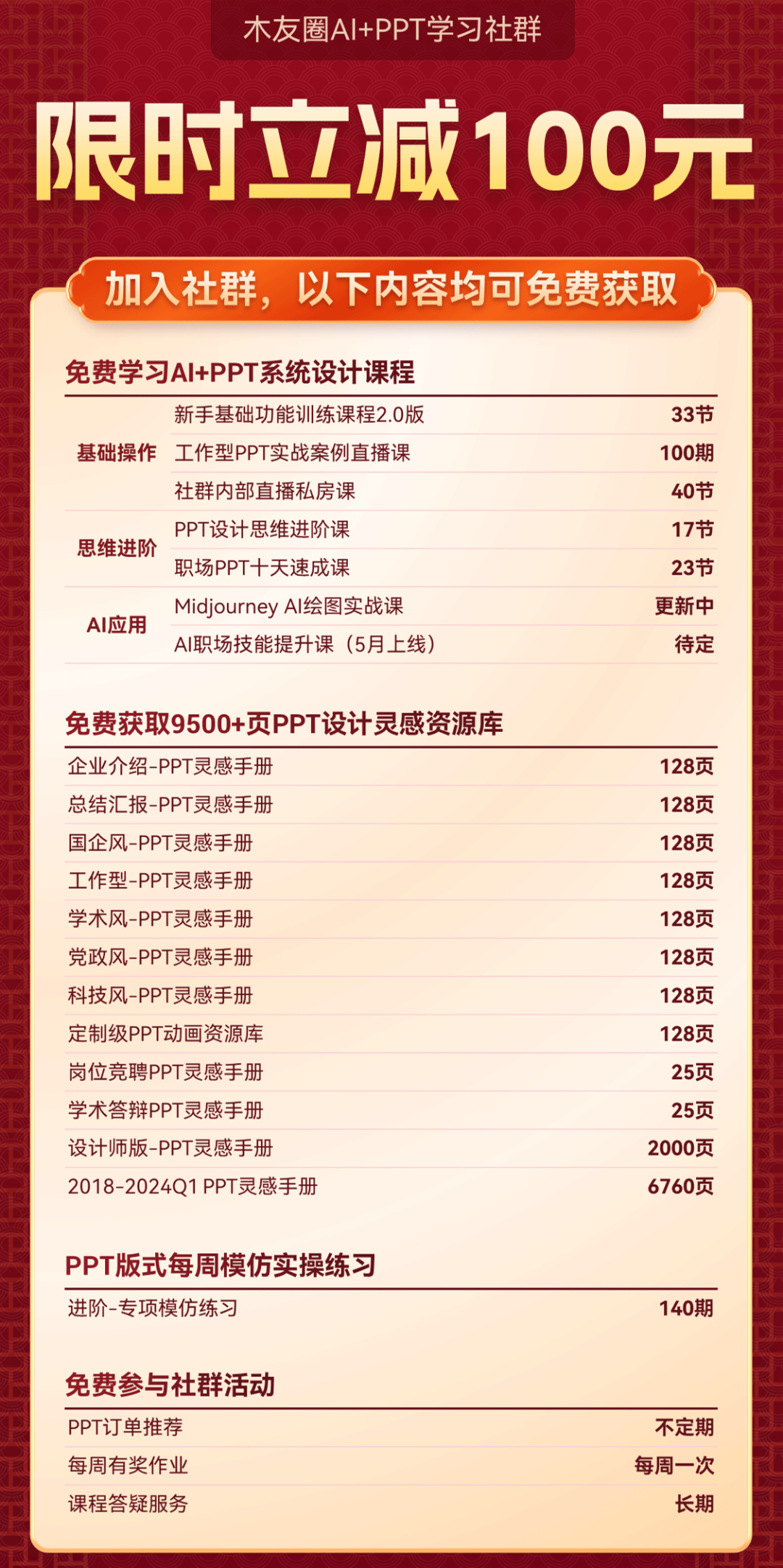 如果说你还没加入社群,可以趁现在限时立减100元的活动,加入后,除9500+页(共18套)PPT模板外,还有7门系统AI+PPT课程免费学: