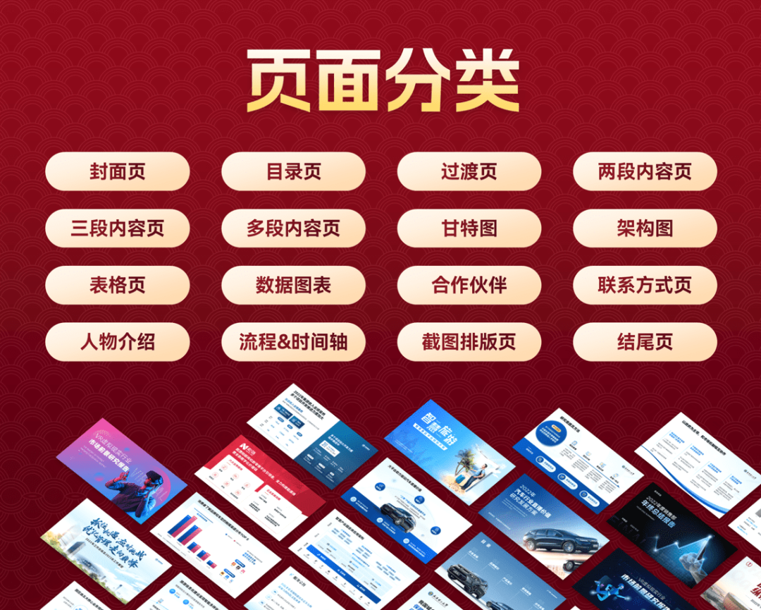 另外,咱们模板可以一键更换/设置你自己想要的配色与字体:关键我们还根据常见的页面类型进行了分类,方便你查找:![]()