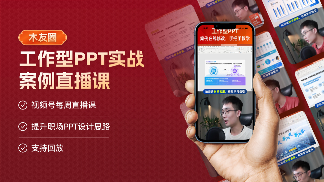 3)100期工作型PPT实战案例直播课(支持回放)工作日每周晚8:30,我会在视频号:跟我学个P 直播,用真实的职场案例教学PPT的核心设计思路,并现场解答学员问题。![]()