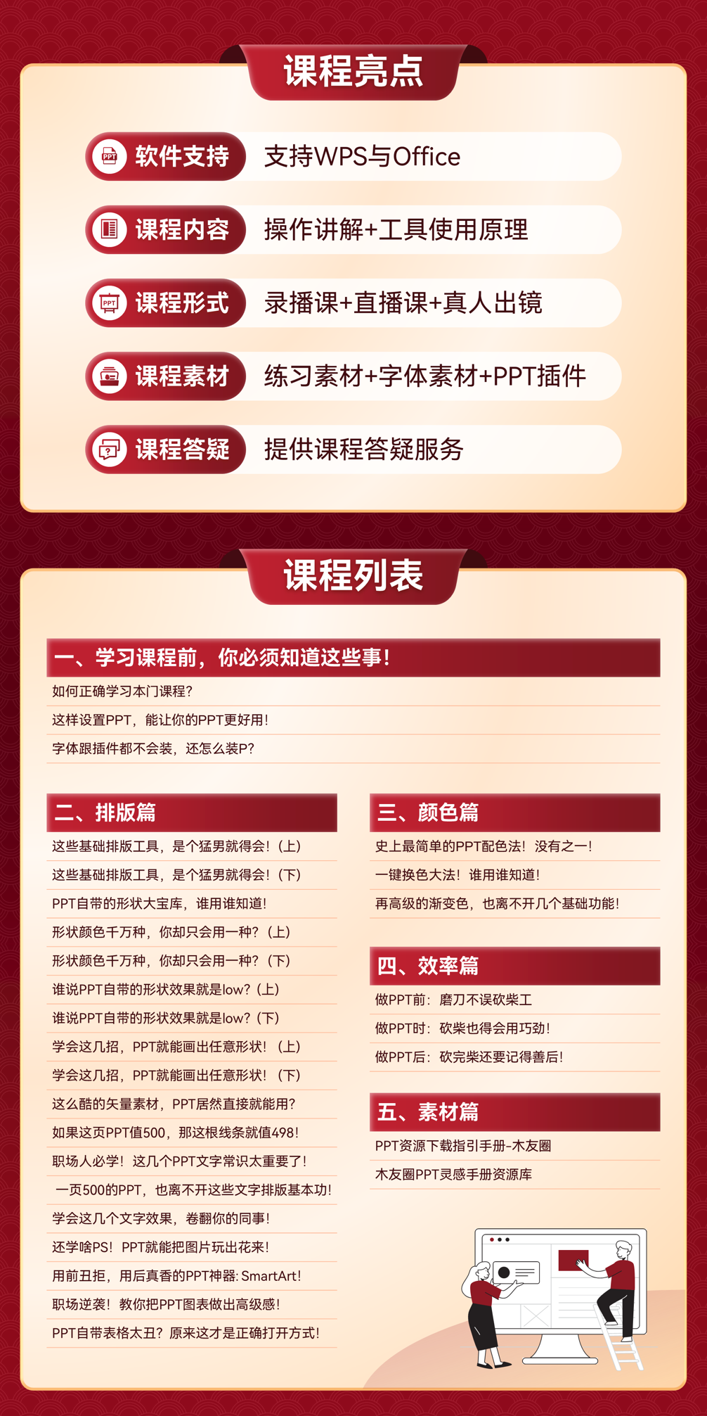 这门课主要是针对性帮助职场人快速解决工作型PPT各类问题,基本上只要你每天下班花费1-2小时,学会后就能快速完成PPT制作:![]()