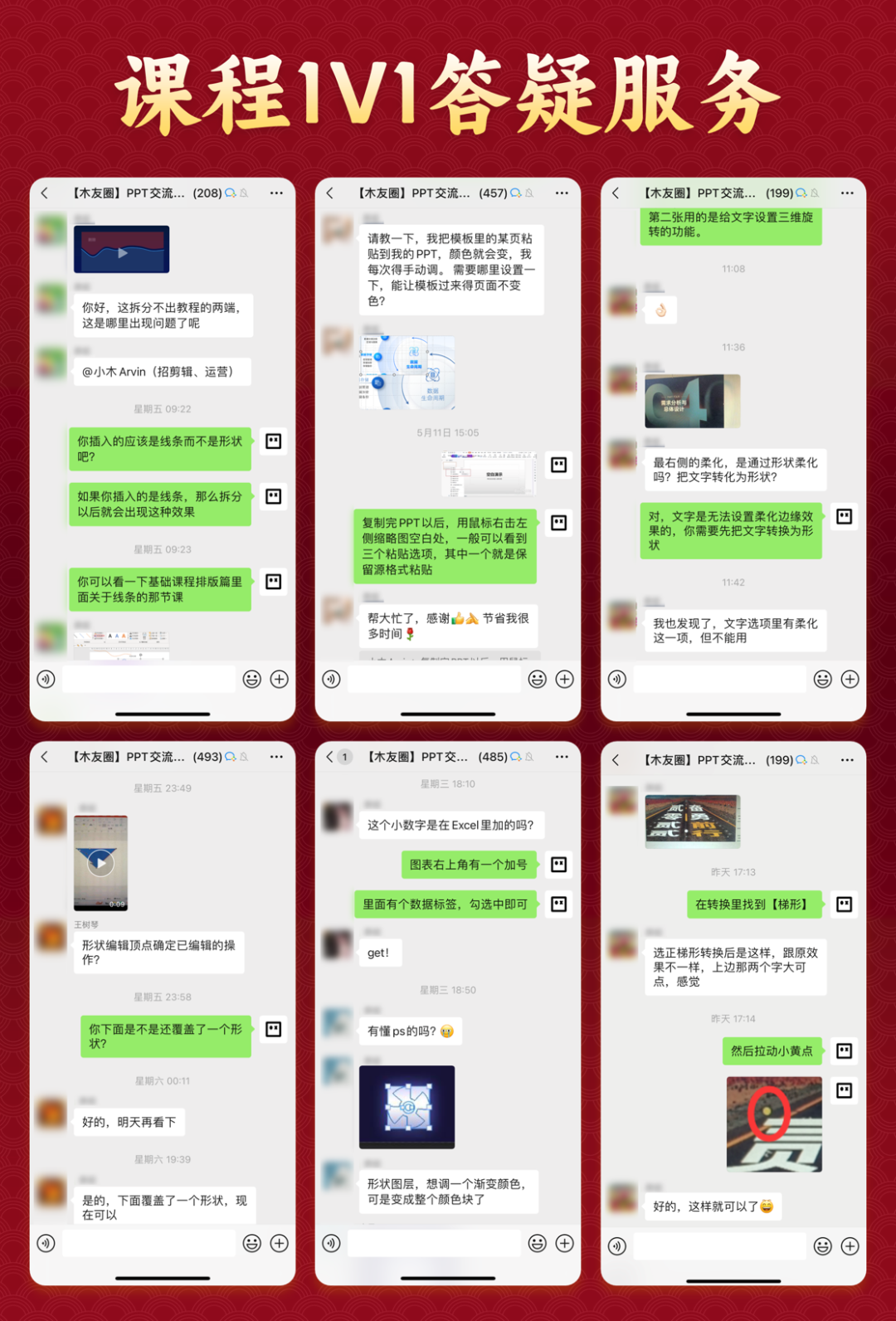 不同于某宝上面那些一页几块到十几块钱的订单,我们社群里的订单的价格都在50-200元/页,部分甚至达到300-500元/页。为了能让大家真正学好PPT,我们社群里有助教老师在微信群里提供课程答疑服务。从2018年至今,这项课程答疑服务我们已经坚持了5年!![]()
