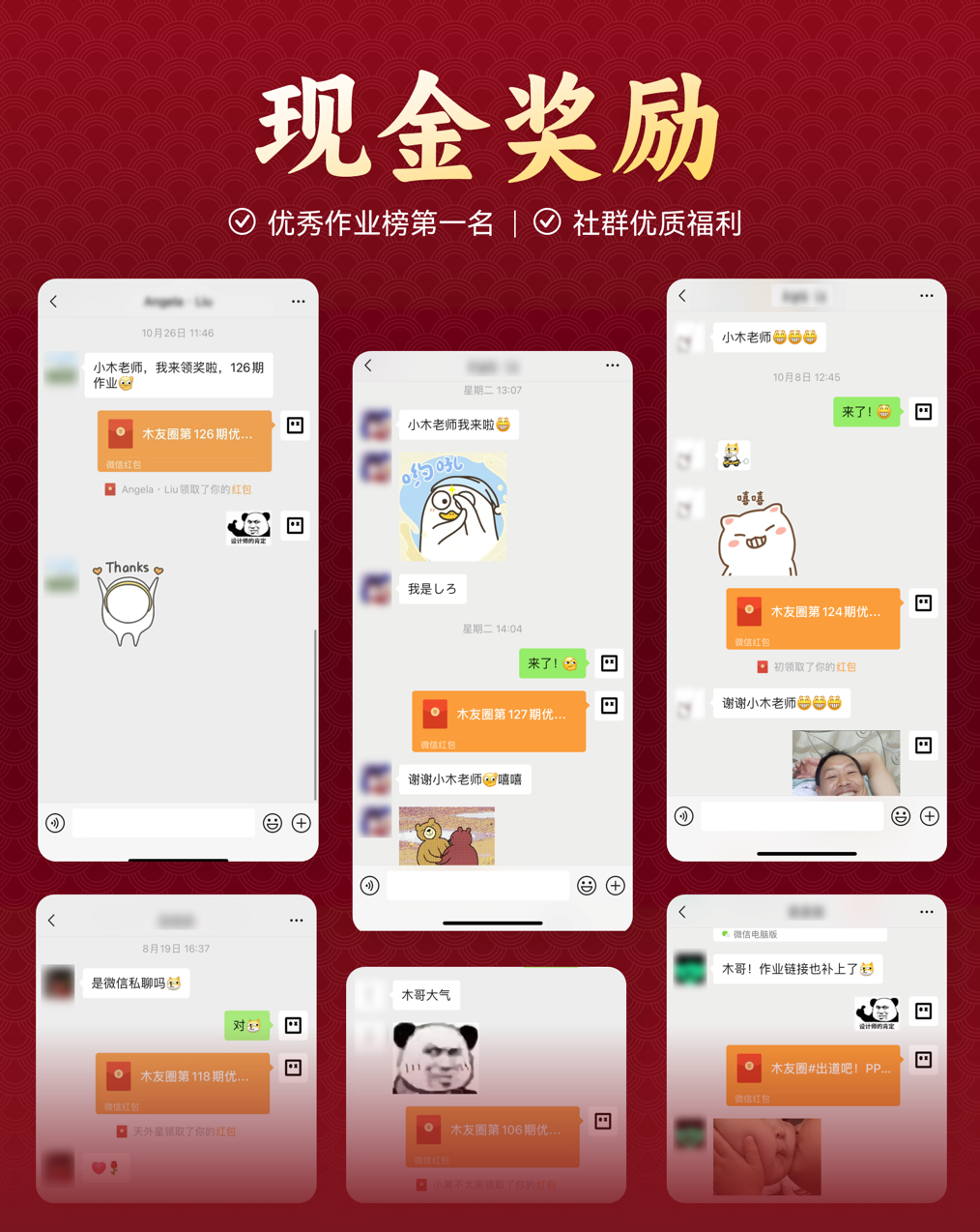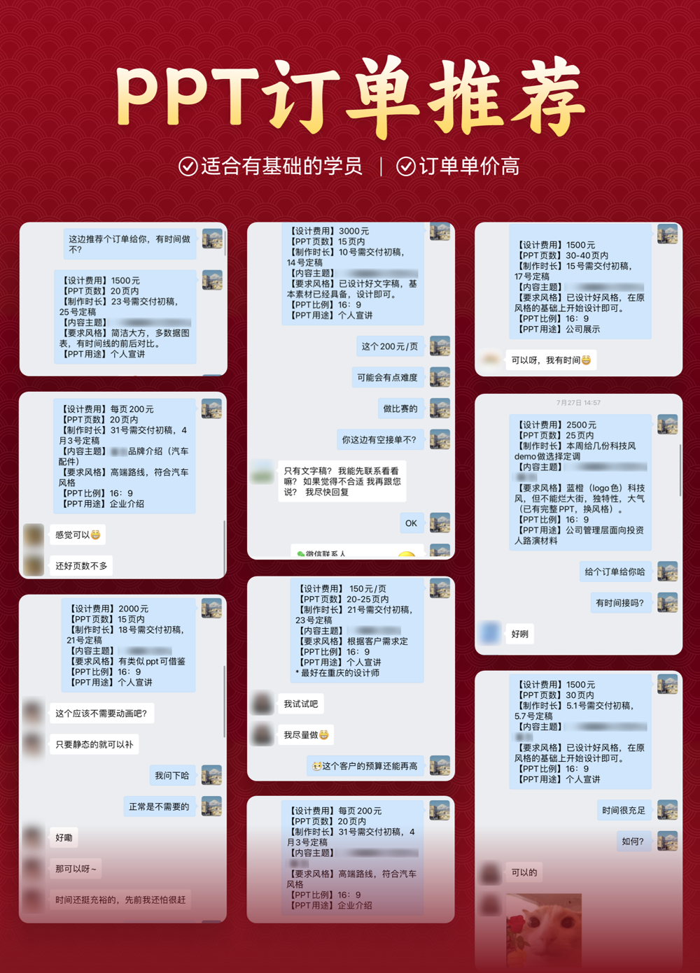 当你熟练掌握一定的PPT设计能力后,社群还可以帮你挣点零花钱。简单来说,我们会不定期把客户的PPT订单推荐给有设计能力的学员。![]()