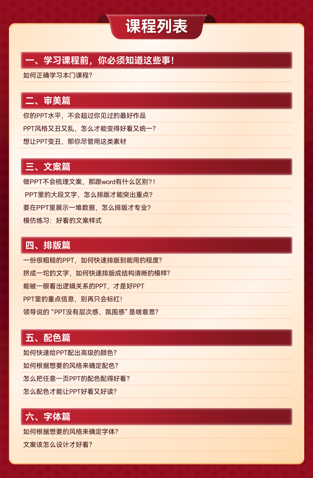 平时错过直播也不怕,因为直播课是支持回放的,学员在社群内可反复观看。目前这门课程一共100期(已完结),如果你在职场工作中经常需要做PPT但每次都没思路/没效率,强烈推荐你去看这门课程。如果你觉得你基础操作会了,但实际运用起来经常遇到问题,推荐你去学下社群内部私房课(40节已完结),建锋老师主讲,教你PPT中各种高级的设计思路与技巧:![]()