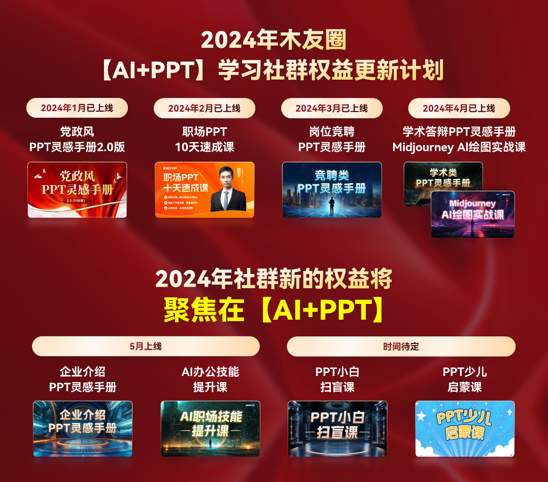 木友圈是我在18年建立的一个职场技能学习平台,加入之后你可以获取到系统的Ai+PPT课程以及海量的优质PPT资源。