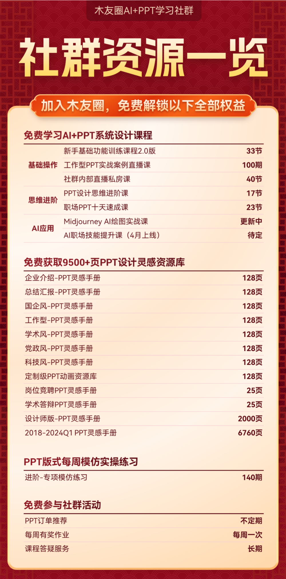 以上7门课程对外的总售价超过了1650元,加入【木友圈】AI+PPT学习社群后,免费学习!