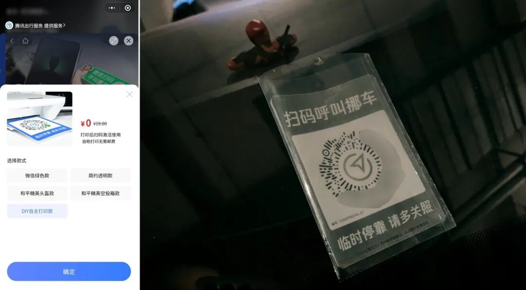 腾讯挪车码服务本身是免费的,只是想要成品车贴则需要付费购买。腾讯也免费提供了小程序二维码的高清图片,我干脆直接打印了出来,用透明文件夹裁剪一下作为塑封,临时停车时从手套箱拿出来插在车窗前面即可。如果你有彩色打印机或者照片打印机,那么效果会更精致一些。
