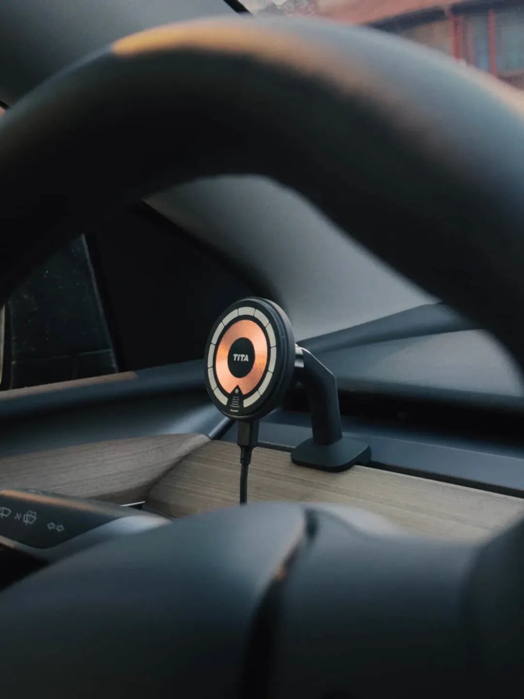 在车机自带地图变得好用之前,手机支架算是每一个特斯拉车主被迫必装配件,我目前使用的是来自 tita 的唛,这款安装简单,只需要插进饰板一按,一秒就能完成球头底座的安装。
