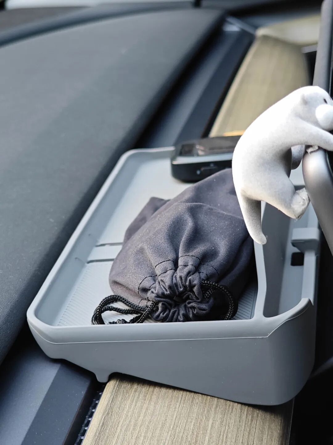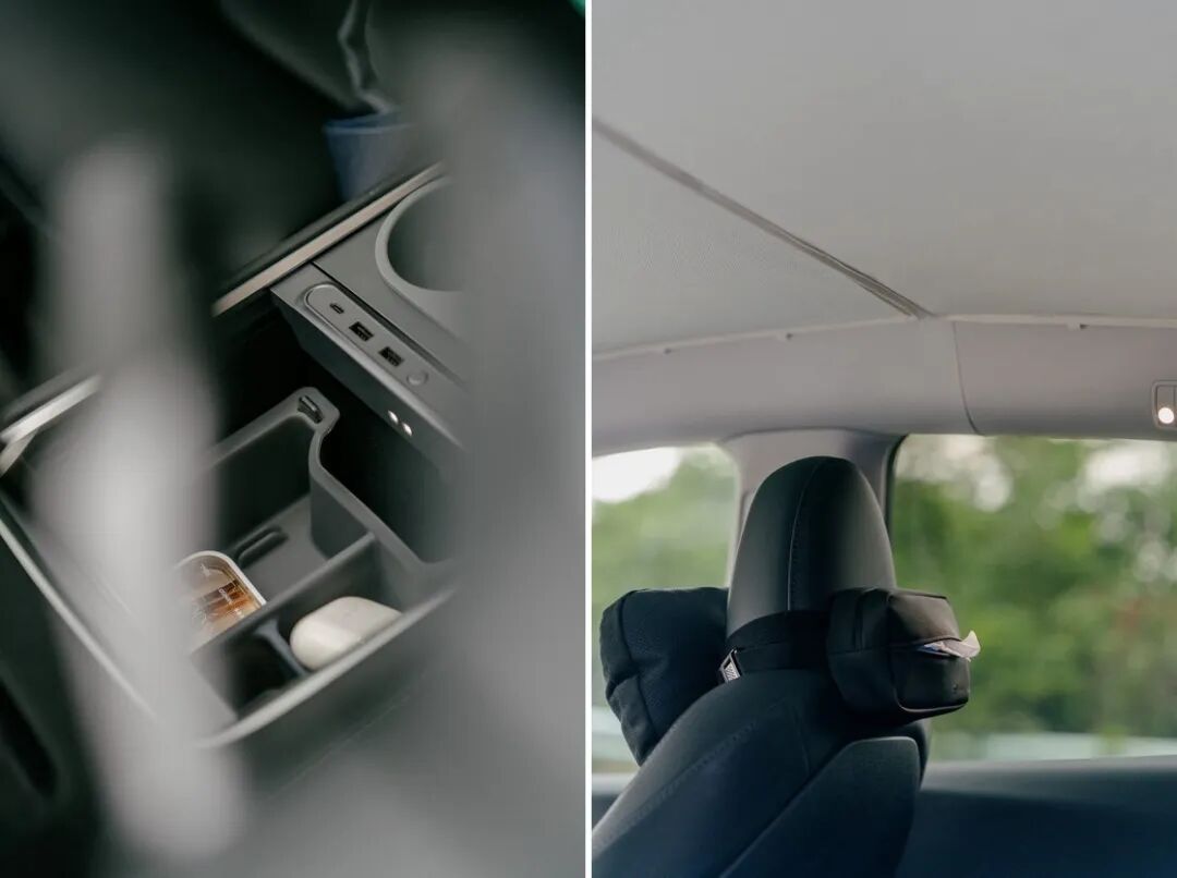 在收纳整理方面,除了车内自带的诸多储物格,我唯一扩展出来的地方就是屏幕后的储物小托盘,除了能放下墨镜或抽纸,还有个磁吸的模块用来放置 ETC,由于藏在屏幕后,日常开车也看不出来,另外角度刚好也可以让 ETC 晒太阳。