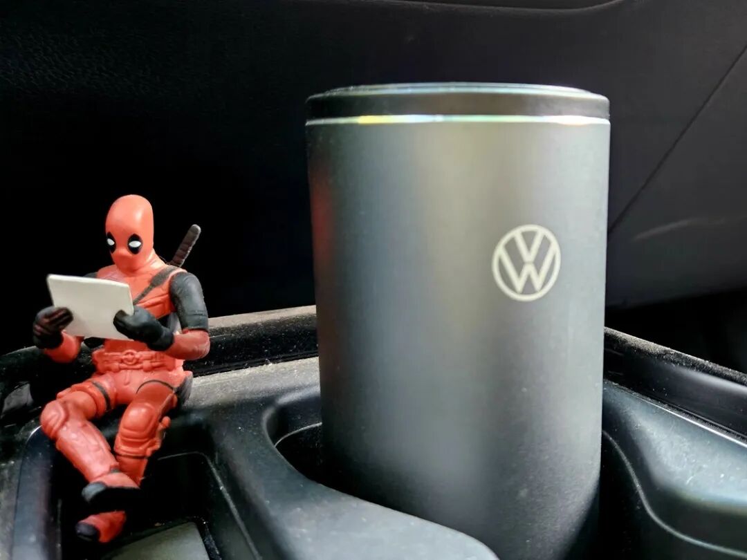 除了常备湿巾随手擦拭外,我还有几个「0 元购」的车载工具。第一个是通过积分换购的大众定制车内垃圾桶,反弹开盖非常方便,自带的一卷垃圾袋如果用完了,也可以使用小尺寸保鲜袋替换,用完的湿巾纸巾、吃口香糖的外包装随手扔进去、下车换掉垃圾袋丢掉,不在车内留下一丝痕迹。