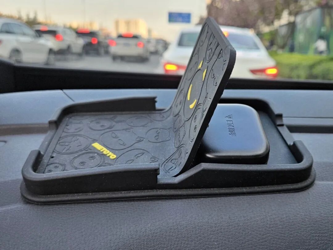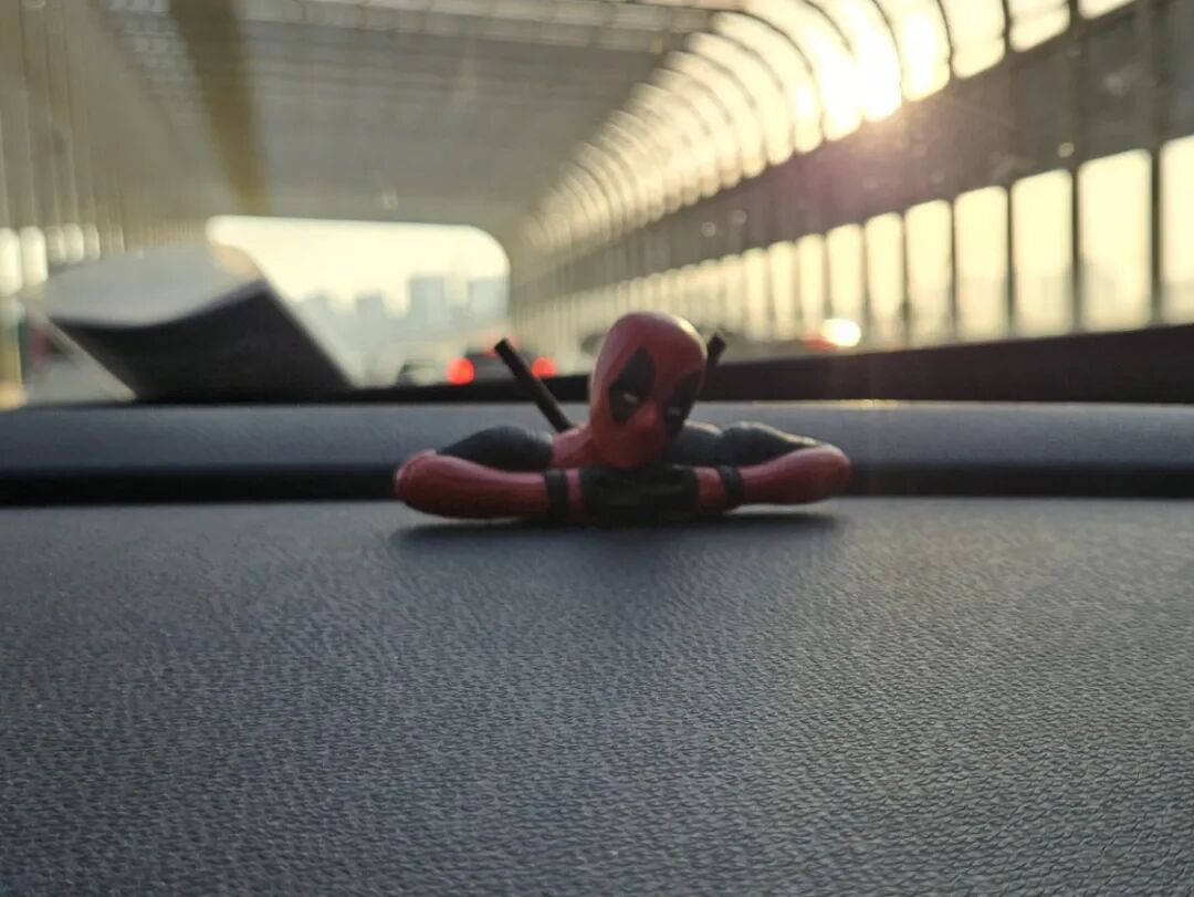 一个多功能置物盘,拥有一个可折叠的挡板,立起来能放手机(作为支架并不是很好用),躺下去能放东西,现在被我用来放 ETC 和员工卡;两个 9.9 包邮的死侍小摆件,堵车时我甚至会跟它对话…