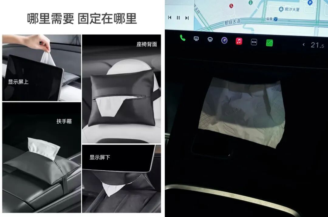 作为一个吞纸达人,我所处的每个空间都必须有一包纸巾,考虑到家里用车时通常人都在前排座位上,所以车载纸巾盒最好是放在前排。不得不说特斯拉真是车界里的 iPhone,大部分车载用品都用专门为特斯拉设计的,我购入的这款纸巾盒也不例外,物美价廉。我看着这款纸巾盒的隐形设计,整体都是黑色的,将它装在中控屏下方完美隐形,纸巾盒内有纸巾的情况下只能看到半张白色的纸巾,存在感极低但抽取很顺手。这款纸巾盒属于是我用烂了还会再次回购的产品。