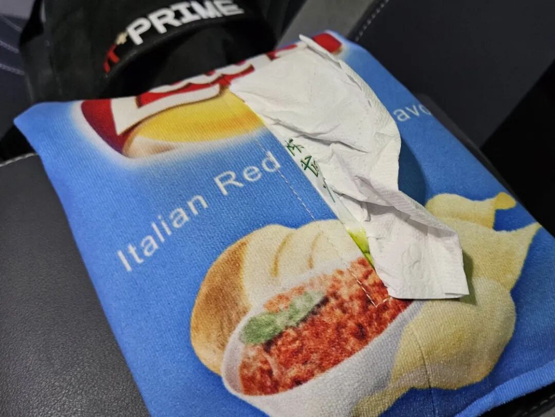 我是一个很喜欢「搞怪」的人,所以我的车内配件也有一些好玩的小玩意,比如这个车内抽纸盒(其实也不是个盒子)。它是由绒布缝合而成,外观是一个薯片包装,通过子母扣固定。我把它绑在了扶手箱上,好几次有朋友上车时都以为我买了包薯片,还没坐下就伸手要把它扔到后座上。每每有这种情况发生,我都会觉得「这东西买对了!」