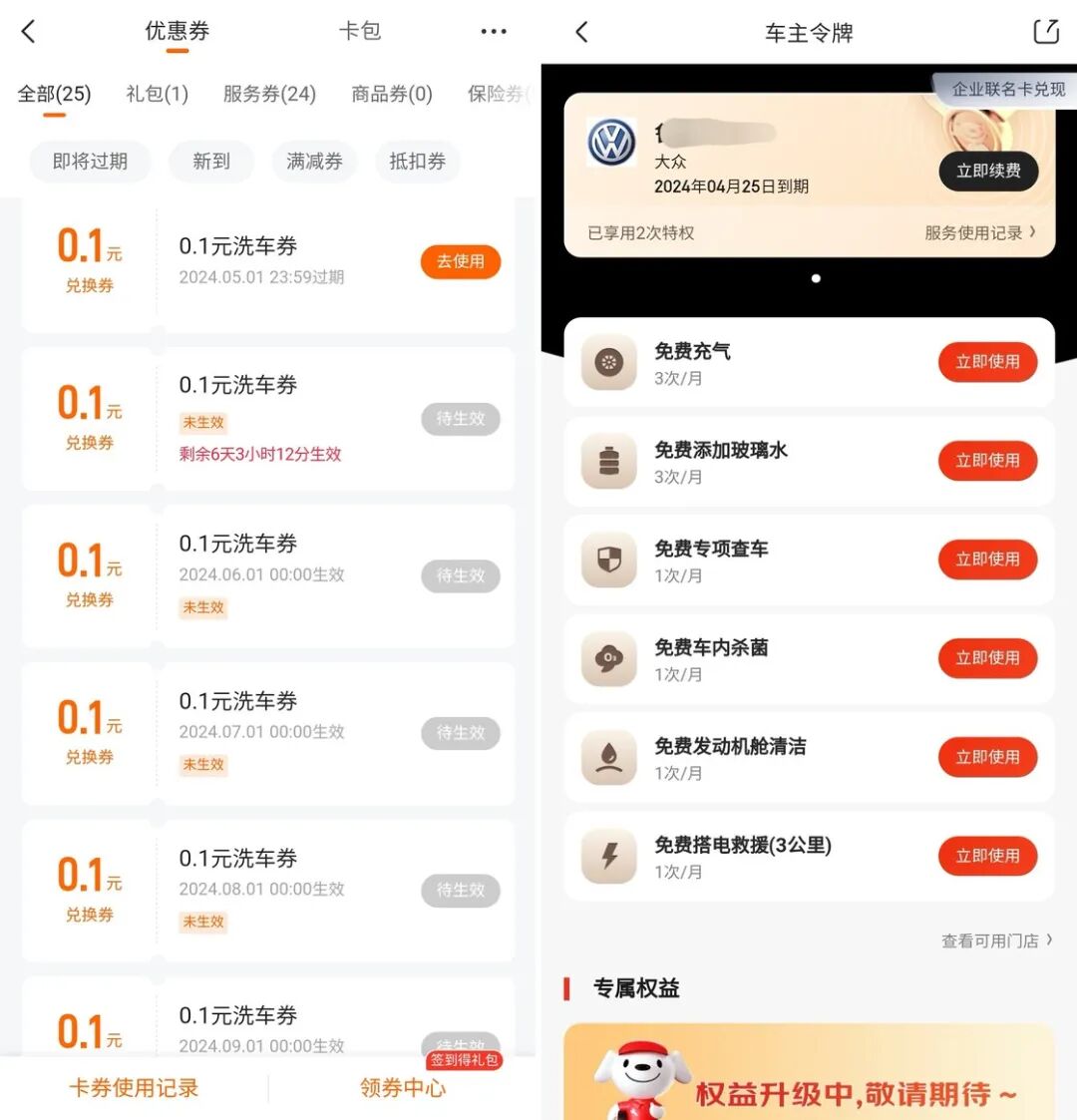 另一个能够降低洗车成本的方式是车险。因为现在各家车险报价都非常接近且现金优惠普遍缩紧,保险公司和销售顾问为了拿业绩,在附加权益方面会比较放松。比如今年某家车险额外赠送了三次代驾券,而我并没有开车出去喝酒的习惯,于是我向销售顾问争取了一下,置换成了每月一次洗车券。