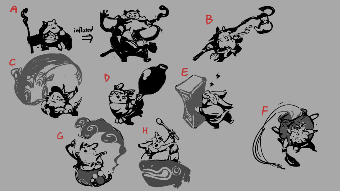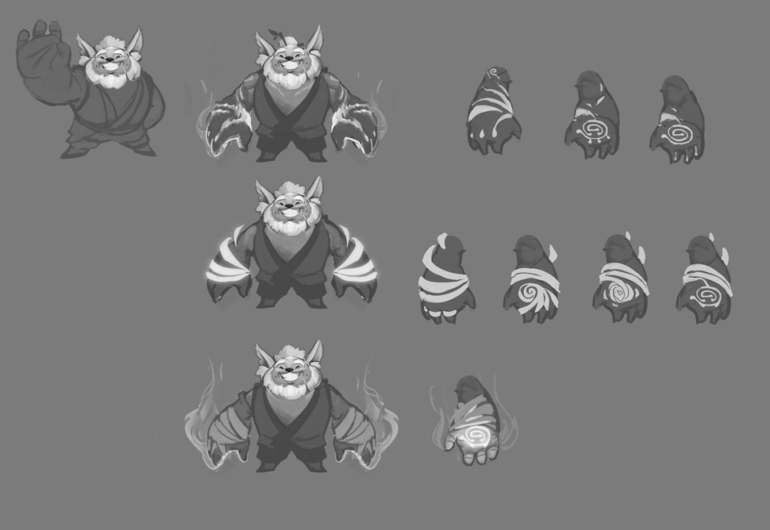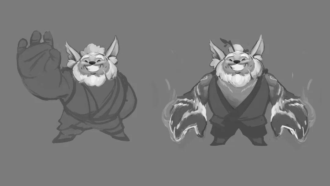 设计师们经历了无数概念设计和反复修改才走到这一步。在最后时刻,设计师Sloan请美术组又改了一稿,KK发了一个刚刚画好的草图,上面的约德尔人有着毛茸茸的粗壮臂膀和宽大手掌,摆出了很酷的掌法,Sloan一下就被打动了。